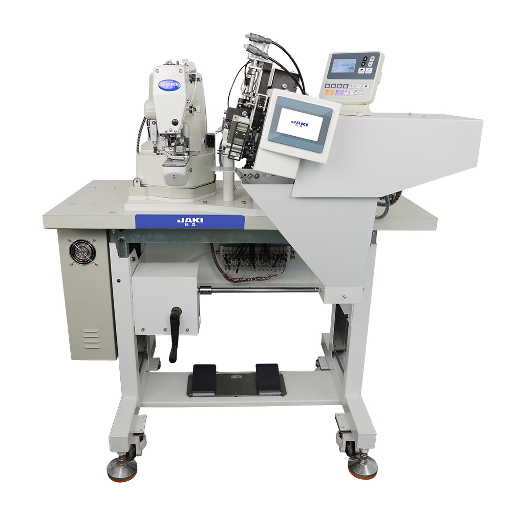 本机在高速套结机JR430D的基础上加装自动送裤袢自动卷裤袢机构,能自动缝制各种类型的裤袢,自动送袢机构避免夹伤手指,降低安全隐患,大幅提高工作效率。